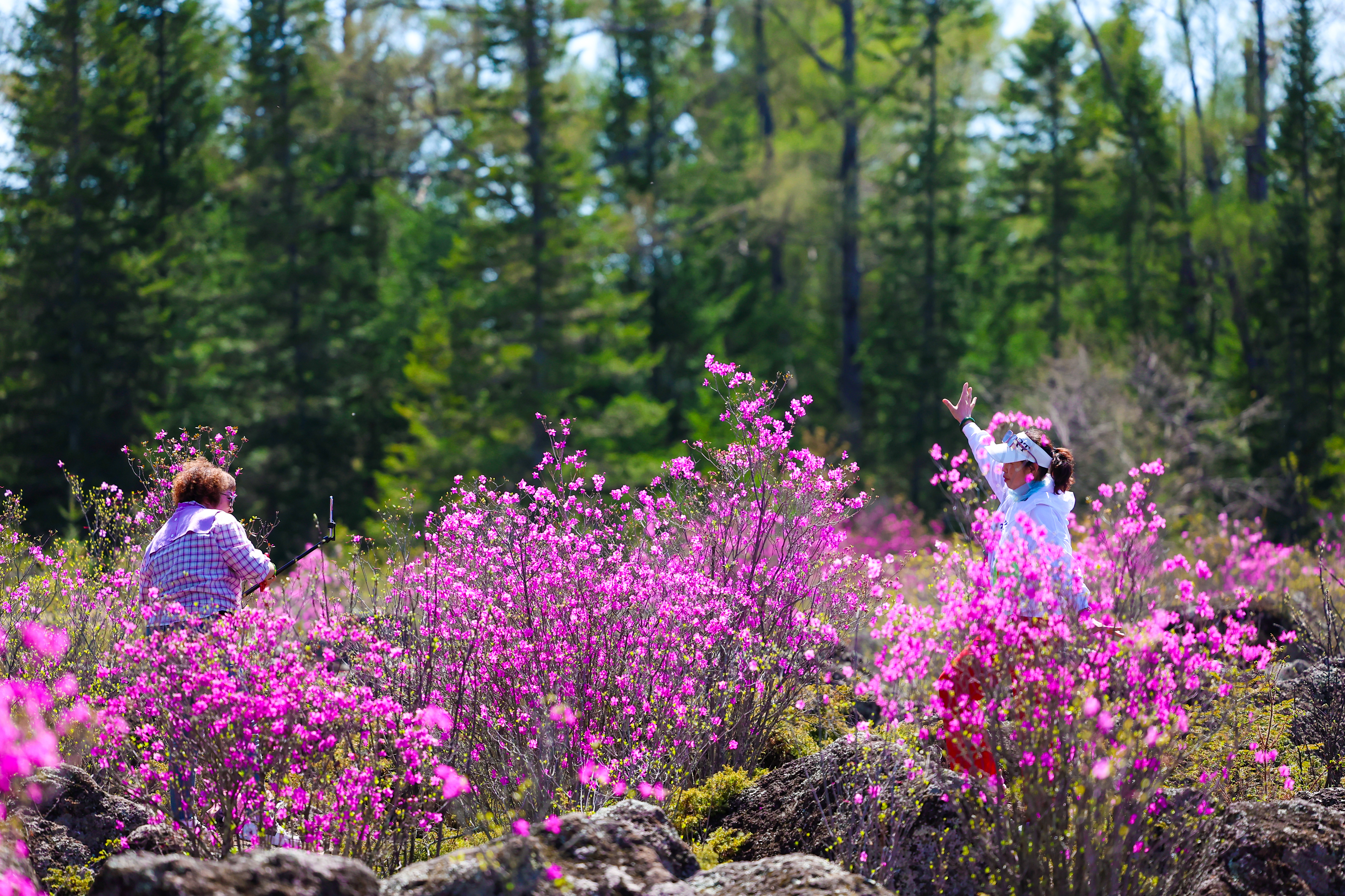 每逢春季,盛放的兴安杜鹃与玄武岩石海相映,形成独特的生态景观