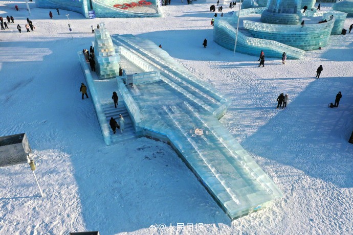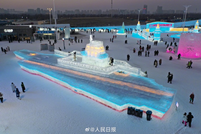 12月17日,哈尔滨冰雪大世界已正式开园。在大国重器景观区,有一尊高8米、长43米、共用2000立方米冰块雕刻而成的冰雕,精准复刻了福建舰的轮廓。除福建舰外,该区域还复刻了快舟系列运载火箭、蛟龙号、“巨浪-3”潜射洲际导弹等国之重器。