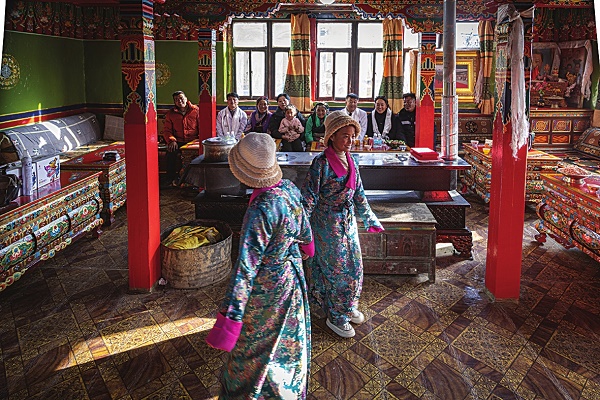 2024年11月30日,在海拔4502米的萨迦县木拉乡达江村,接受过先心病手术治疗的双胞胎姐妹白玛次片(左)和卓玛央吉(右)为回访的牡丹江心血管病医院医疗队跳起舞蹈。