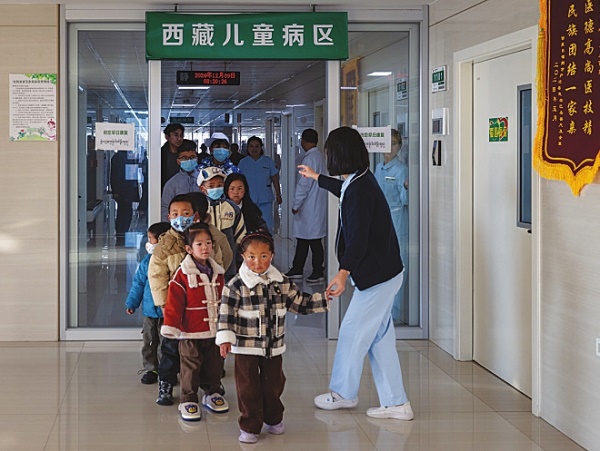 2024年12月9日,牡丹江心血管病医院护士领着患儿去接受术前会诊。为做好西藏先心病患儿救治工作,该院开设了西藏儿童病区。
