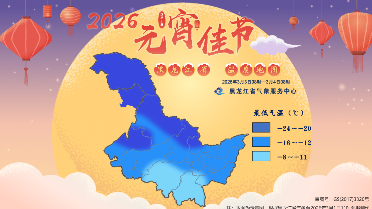 3月3日:元宵节最低气温:大兴安岭、黑河北部、伊春北部、鹤岗西部、齐齐哈尔北部-24~20℃,哈尔滨大部、牡丹江、七台河西部地区-8~-11℃,其他大部地区-16~-12℃。