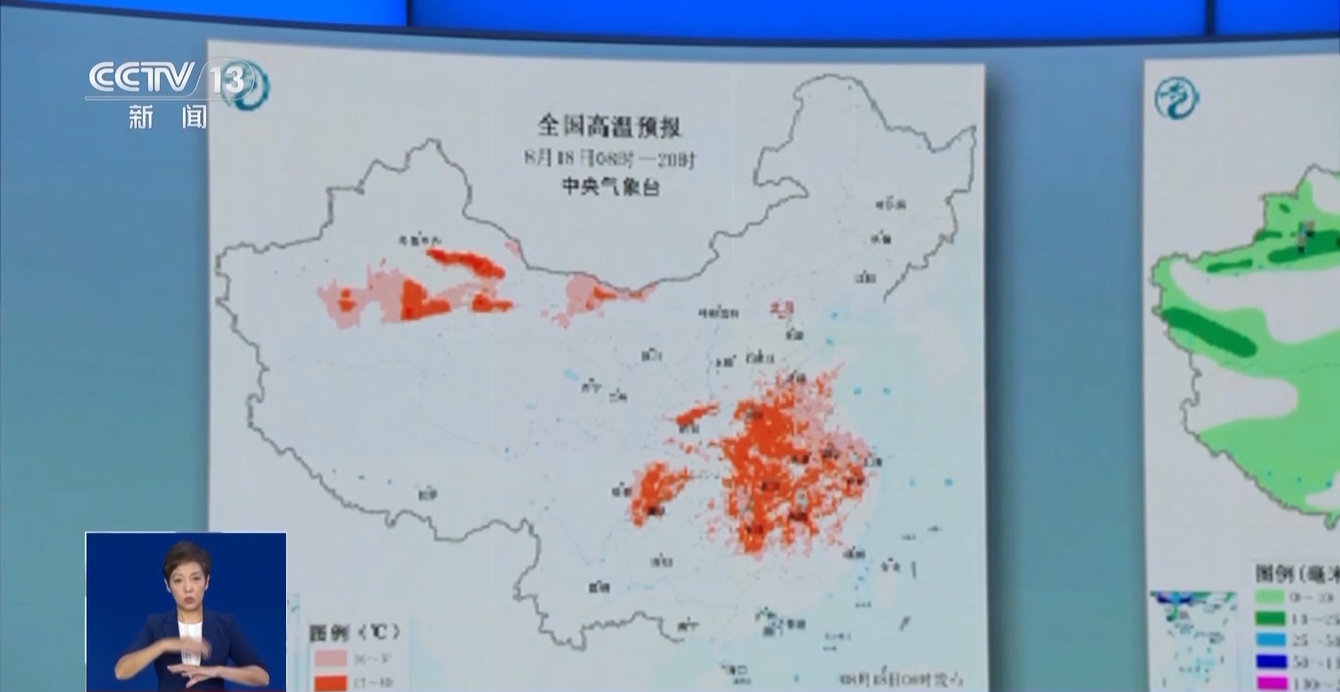 中央气象台发布今明两天全国降水量预报图与全国高温预报图。