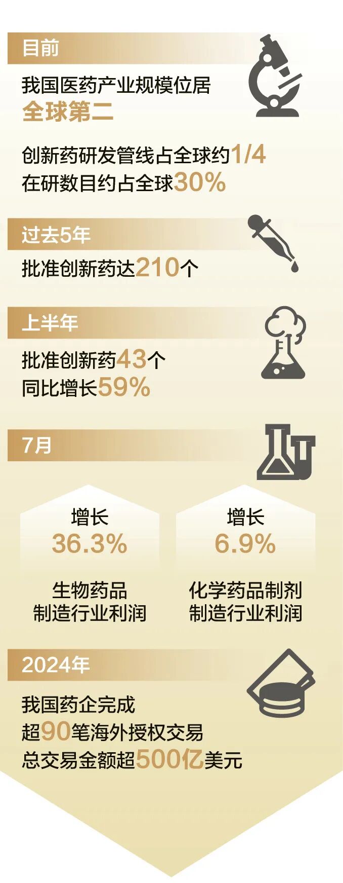 9月1日启动的2025年“全国药品安全宣传周”传递出的信息表明,医药产业创新发展良好:过去5年,我国共批准创新药210个,保持加速增长态势。目前,我国在研创新药约占全球30%。