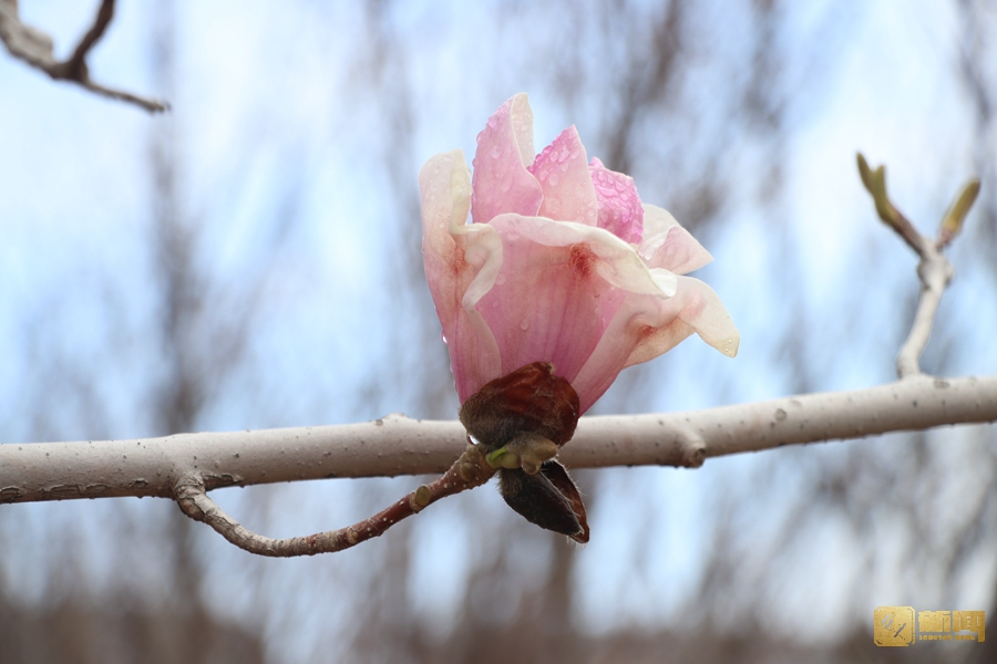浅粉色的玉兰花,在蓝天白云的天幕下独自发光,更显旖旎。浅淡的花色此刻被雨水彻底洇开,边缘泛着淡淡的色彩。