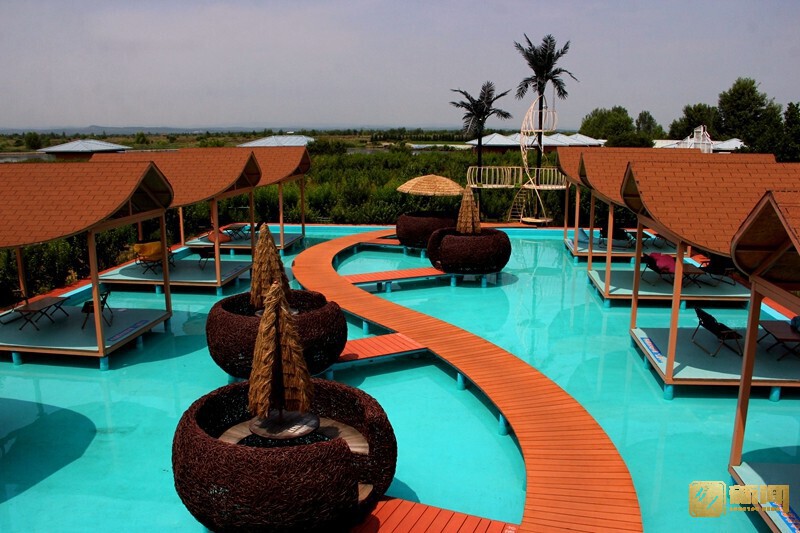 水上区域同样令人惊喜。蓝绿色池面如宝石,茅草顶凉亭、藤编休憩区错落有致,棕榈树影摇曳。躺卧其间,微风拂来,颇有海岛度假的松弛感。