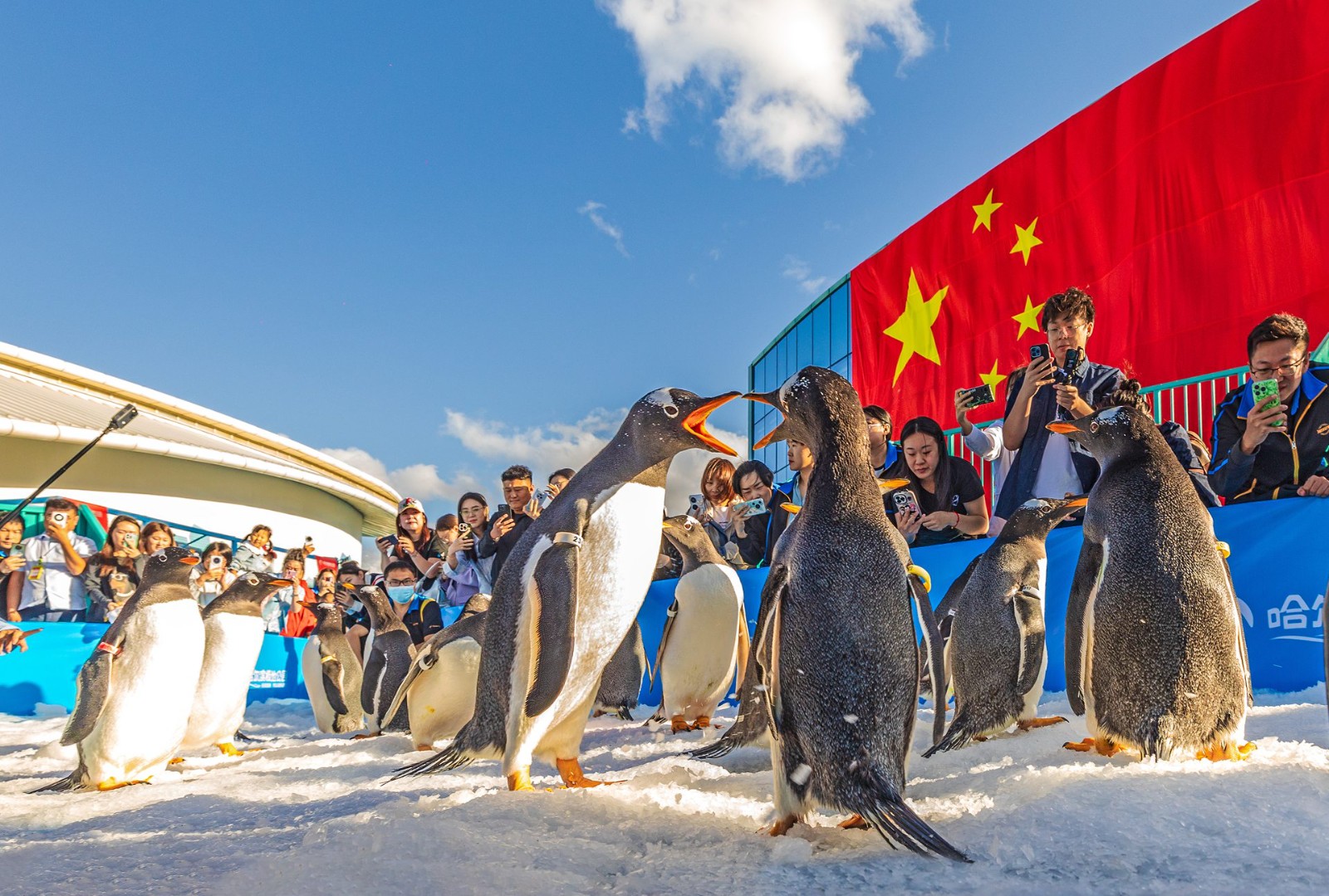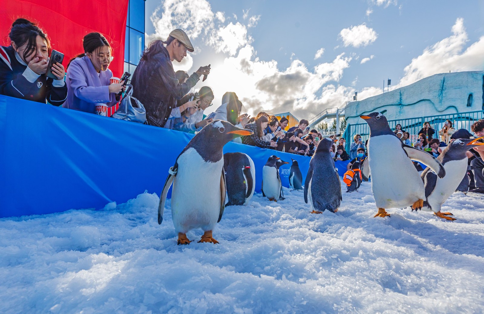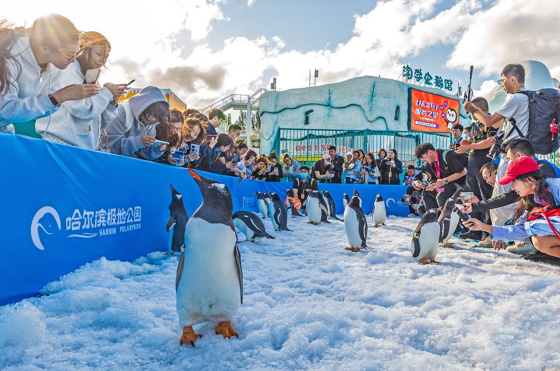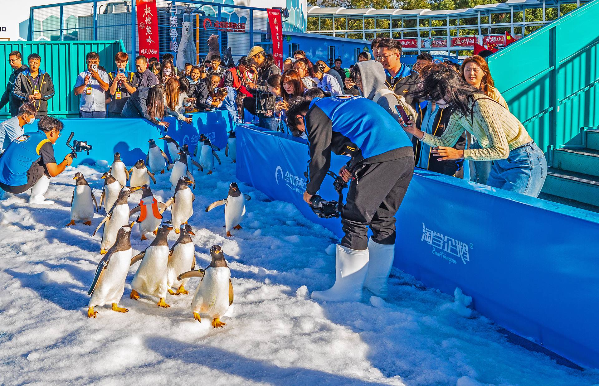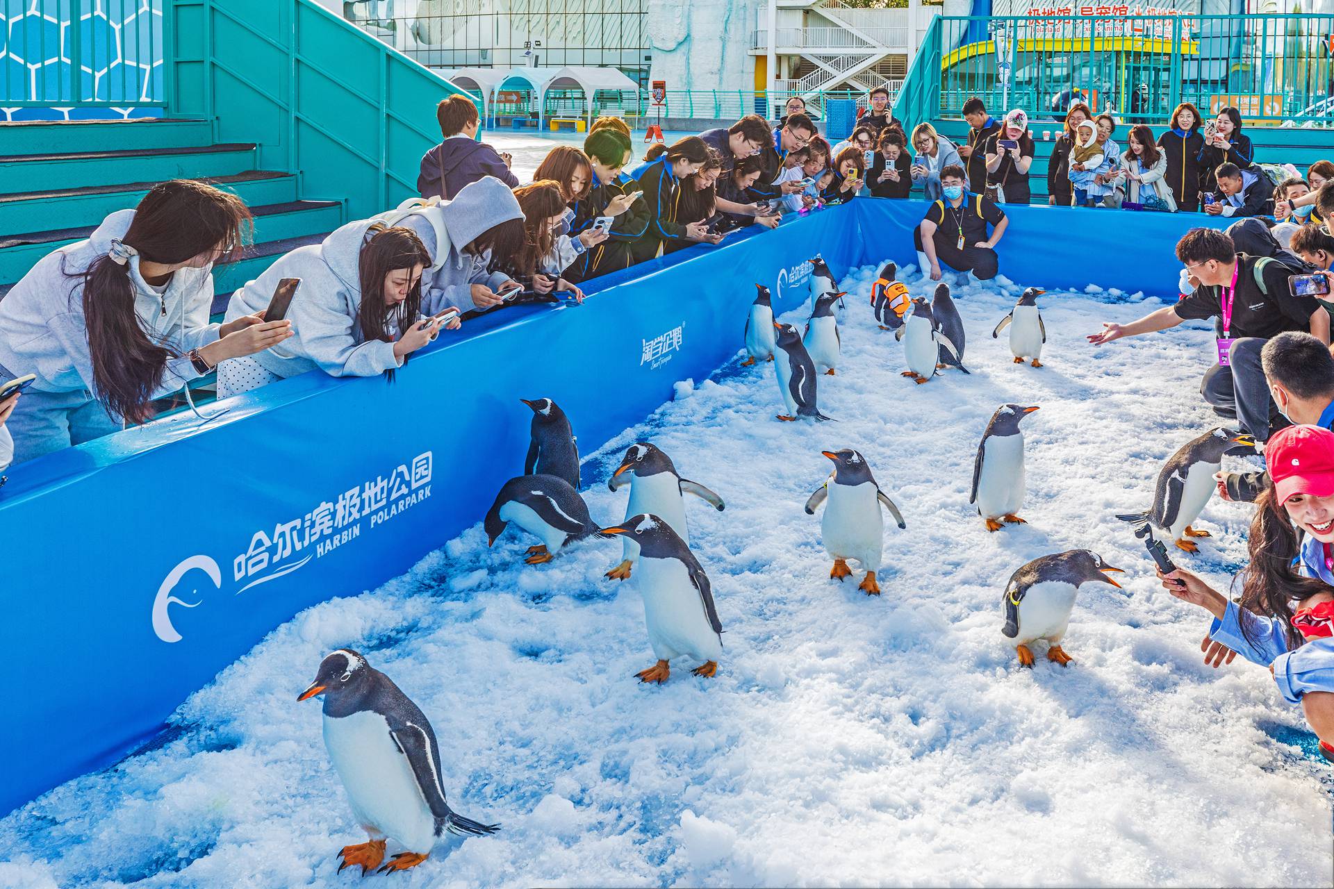 据介绍,参与巡游的企鹅为巴布亚企鹅,又名白眉企鹅,主要分布于南极半岛和马尔维纳斯群岛。巴布亚企鹅栖息地夏季平均温度与哈尔滨秋季平均温度相似。为企鹅巡游准备的通道和场地内铺设了保温冰面,每日造冰量达20吨,保证企鹅巡游的温度环境适宜。