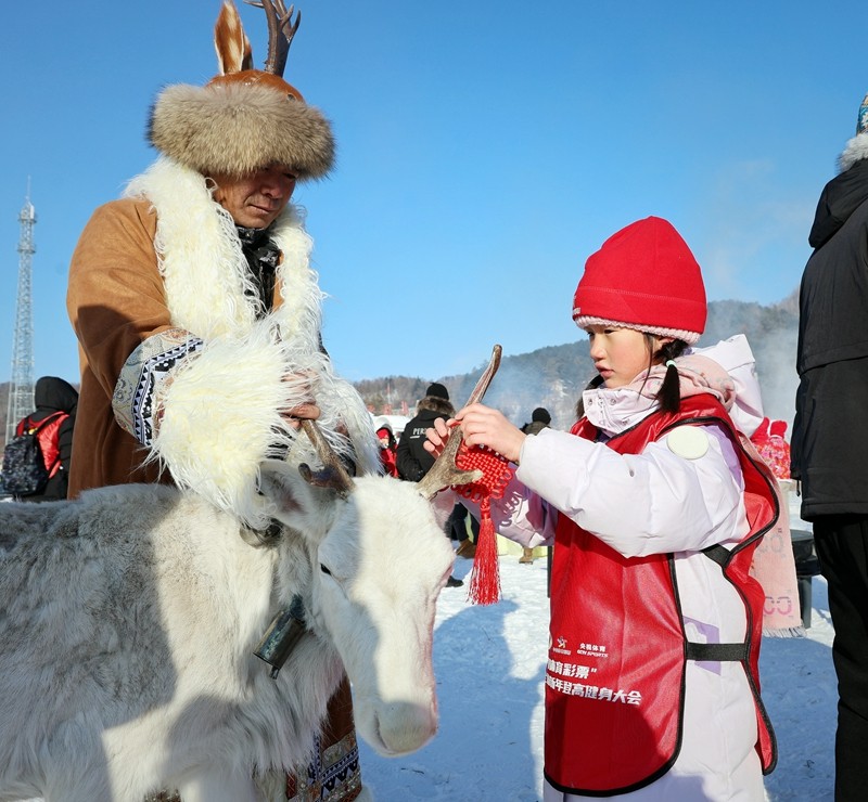 赛道沿线,雾凇琼枝相映成趣,组委会设置的指示标志与保暖补给设施全程护航。终点处,铁锅炖酸菜、鲜醇羊汤、热饺子等特色美食为参赛者驱散徒步疲惫。赛事吸引来俄罗斯、澳大利亚、马来西亚等国游客参与,马来西亚女孩为驯鹿系上中国结,盛赞:“这里就是最美的童话世界。”