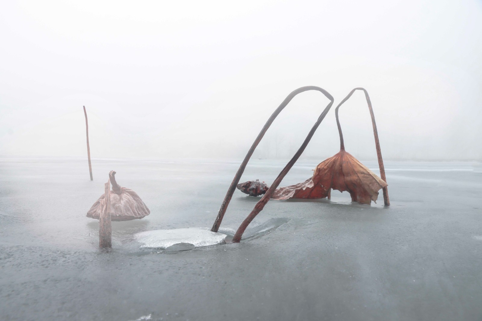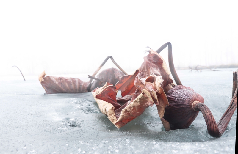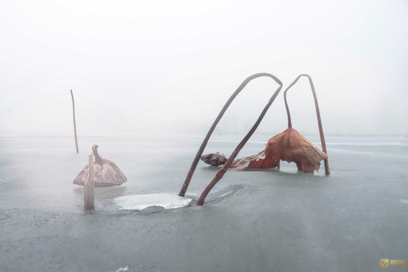 荷花池里,残荷静立水中,在晨雾的映衬下,多了几分风骨与妖娆。雾水轻沾枝叶,静谧中藏着生机,清冷里透着温柔,静静诉说着东宁独有的冬日浪漫。