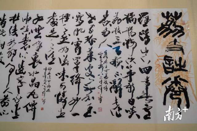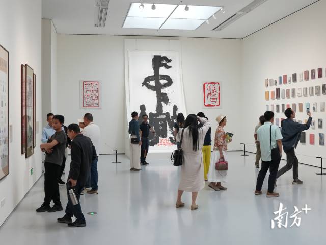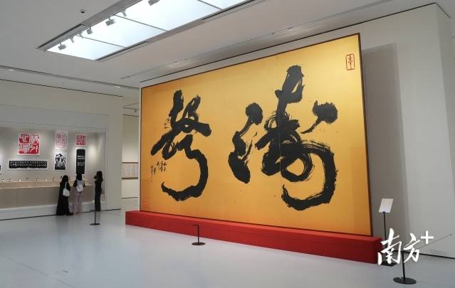 传统“书画印”常常让人感觉门槛很高,但韩老坦言,他更期待此次展览,能让更多普通观众、年轻观众走进来。此次来粤展览的首日,展厅现场来了不少年轻人。一位来自广州美术学院大二学生慕名到此观摩书法,《涛声》巨幅大字让他印象深刻:“听说这幅作品是拿着30多斤重的毛笔写的,非常磅礴大气,韩老不愧是‘天花板’级别的大师。”